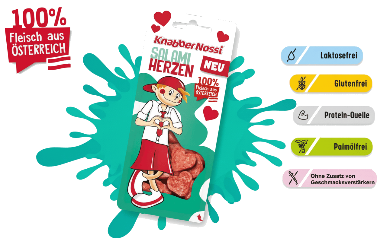 Bei KnabberNossi gibt es jetzt auch Salami – und zwar als coole Salami Brezel. Die Brezel hat einen weichen Biss, ist mild gewürzt und kommt ohne Edelschimmelschicht aus. Natürlich wird auch hier ausschließlich österreichisches Fleisch verwendet und auf Geschmacksverstärker verzichtet.